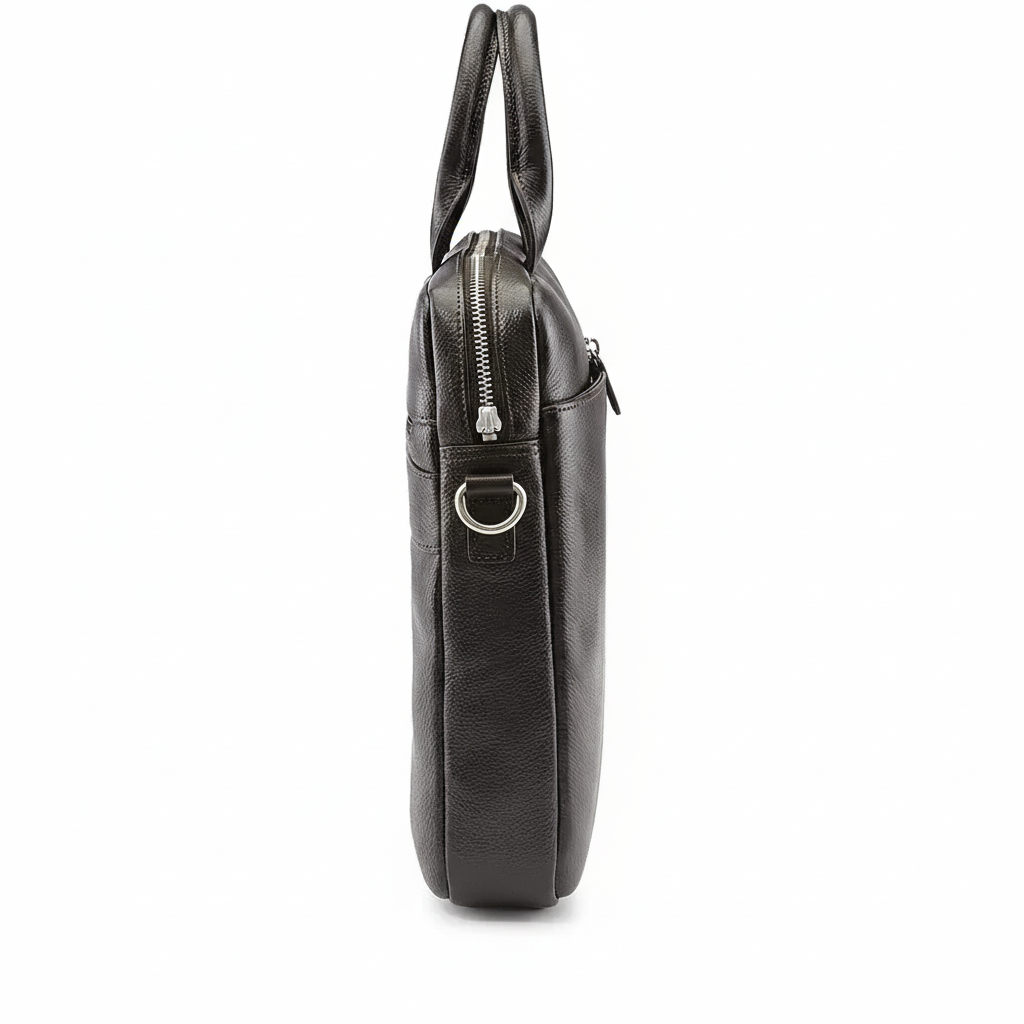 Menší tmavě hnědá kožená taška je elegantní a praktická taška na notebook z pravé kůže, ideální pro stylové přenášení notebooku i dalších základních věcí.